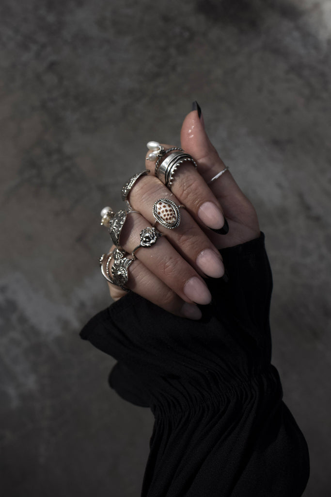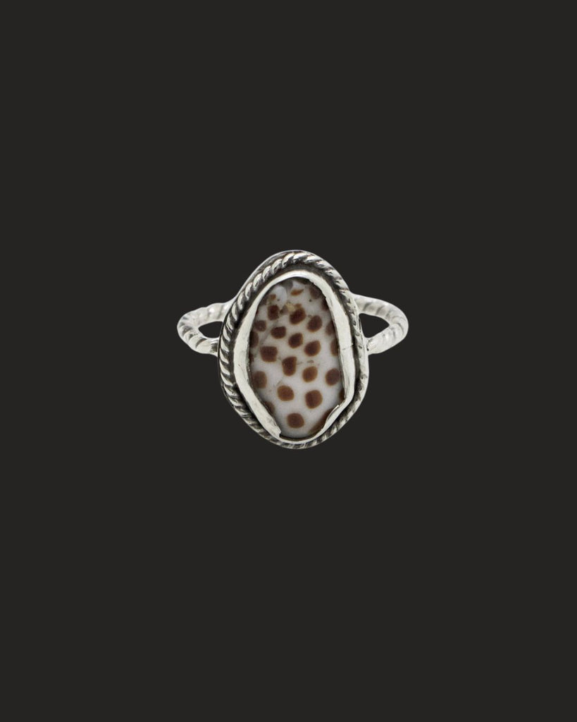 Found on the North Shore of Oahu on the shoreline of the Pacific Ocean. Detailed with oxidation and a twisted silver ring band.