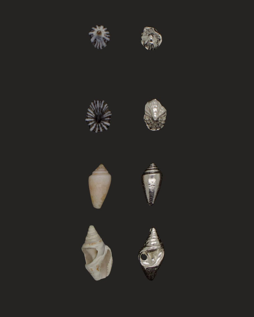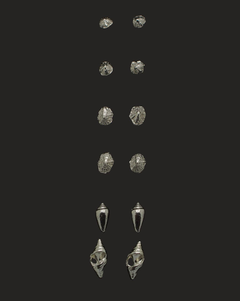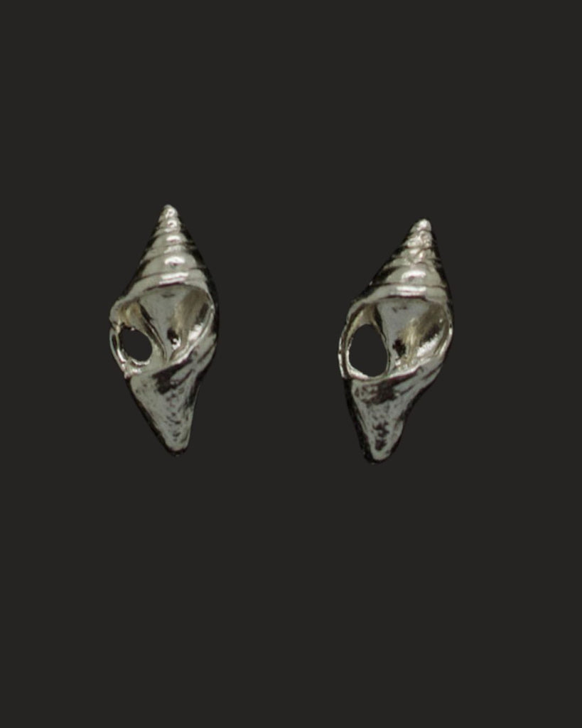 Pair of silver shell-shaped earrings on a dark background